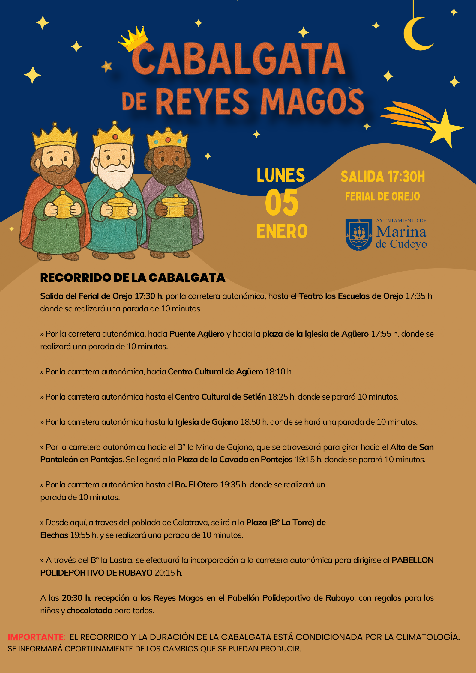 La duración y el desarrollo de la Cabalgata estarán condicionados por la climatología. En caso de que se produzcan cambios en el recorrido, horarios o formato del evento, se informará oportunamente a través de los canales oficiales municipales.