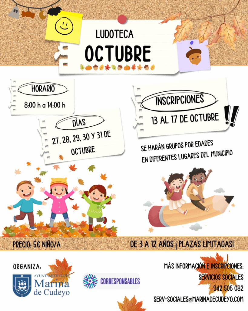 El Ayuntamiento de Marina de Cudeyo, a través del área de Servicios Sociales y dentro del programa Corresponsables, organiza una nueva edición de la Ludoteca de Octubre 2025, dirigida a niños y niñas del municipio con edades comprendidas entre los 3 y los 12 años.